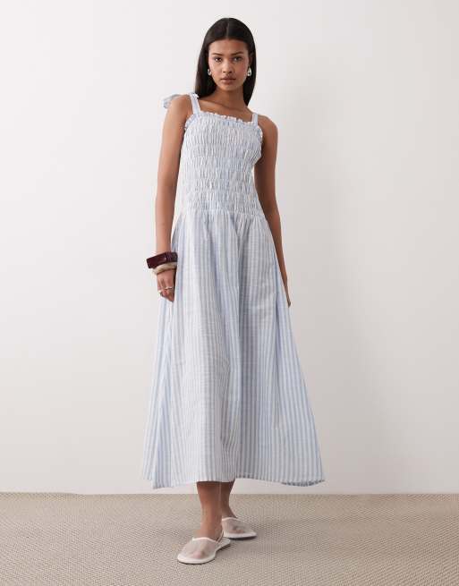 Esmee tie strap shirred maxi beach dress in blue & white stripe