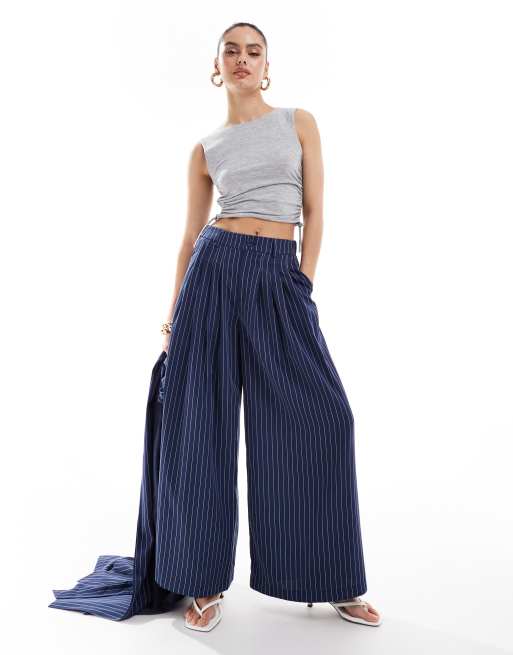 Extro & Vert highwaisted pleated palazzo trousers in blue pinstripe co-ord