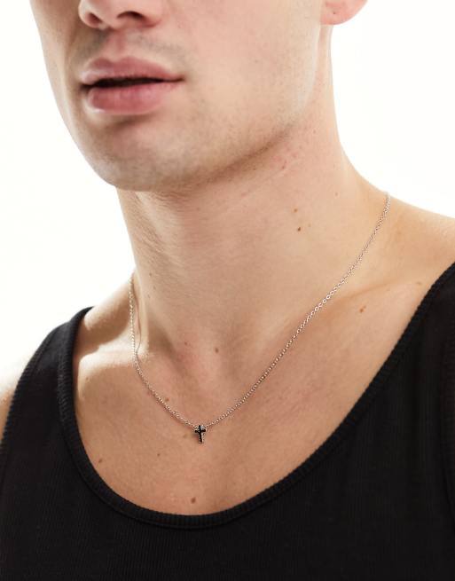 Faded Future minimal cross pendant necklace with black crystals in silver