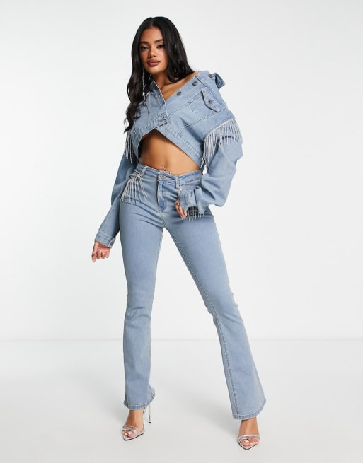 Fae denim jacket, skirt and jean with diamante fringe set in washed blue