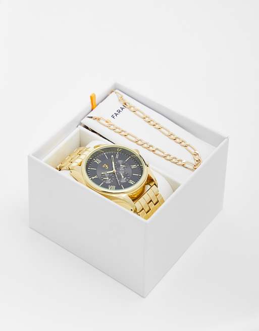 Farah chunky link strap watch and figaro chain necklace gift set in gold