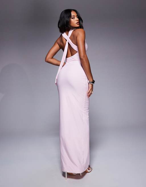 Fashionkilla double sculpted slinky open back drape detail maxi dress in baby pink
