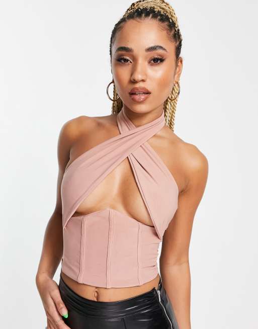 Femme Luxe wrap crop top with under bust detail in mink