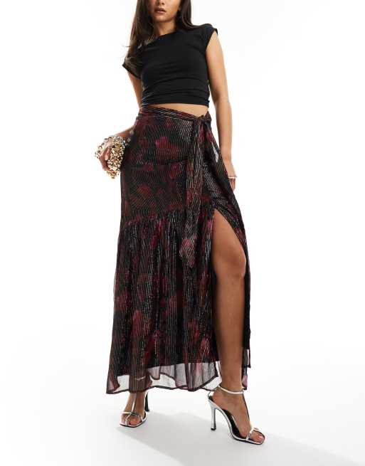 Finding Friday Metallic printed aline maxi skirt with ruffle detail in red