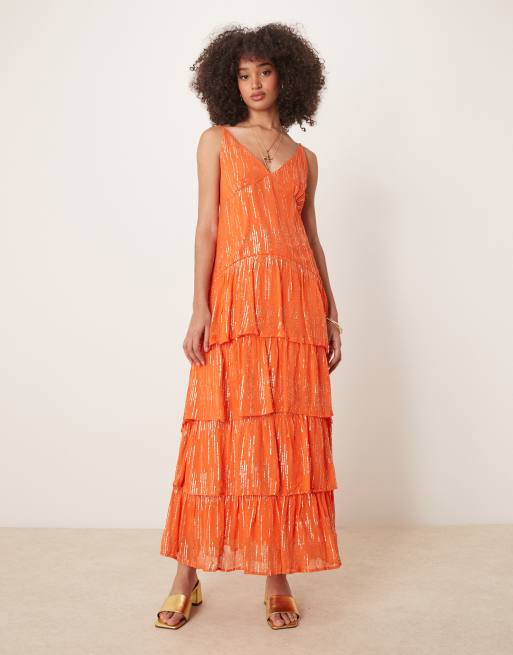 Finding Friday Metallic ruffle strappy shoulder maxi dress in orange