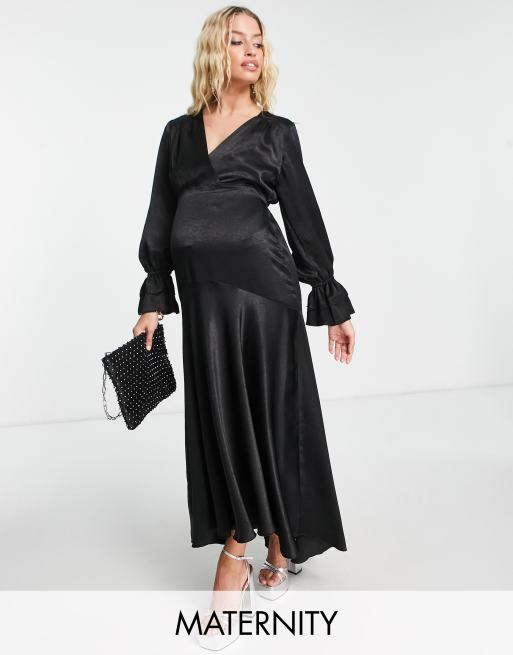 Flounce London Maternity long sleeve midi dress in black satin