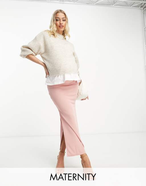 Flounce London Maternity ribbed midi skirt with side splits in light pink