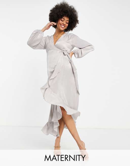 Flounce London Maternity satin long sleeve wrap maxi dress in ash grey