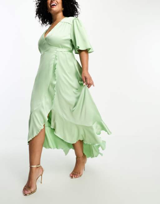 Flounce London Plus wrap front satin midi dress with flutter sleeves in sage