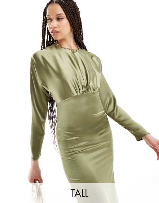 Flounce London Tall satin maxi dress with kimono sleeve in olive
