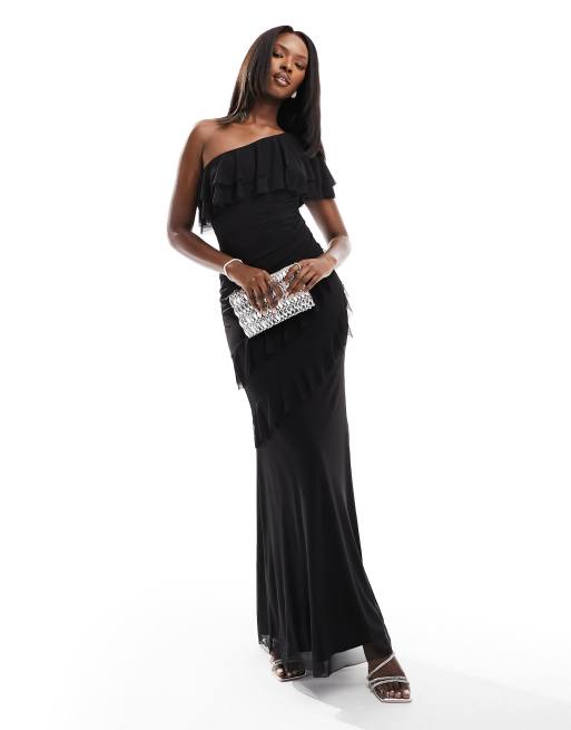 Flounce London one shoulder mesh maxi dress in black
