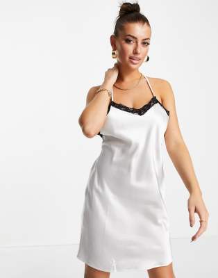 Flounce London satin backless cross strap satin slip dress with contrast lace trim in ivory