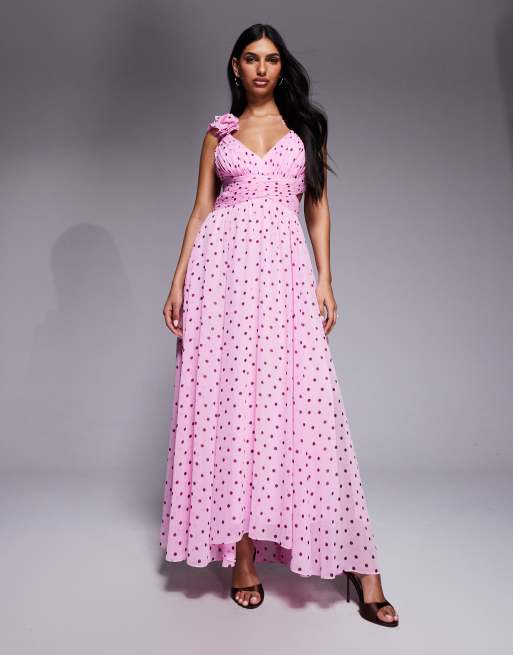 Forever New chiffon ruffle shoulder maxi dress in pink polka dot