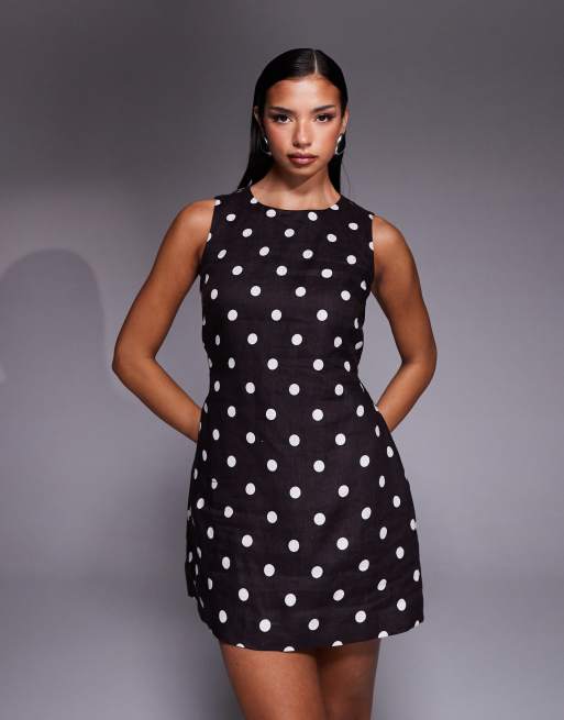 Forever New linen shift tie waist mini dress in brown polka dot