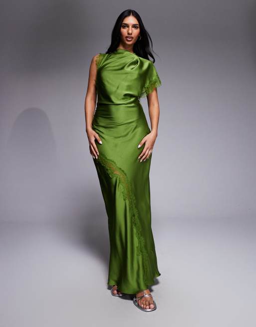 Forever New satin and lace asymmetric shoulder maxi dress in green