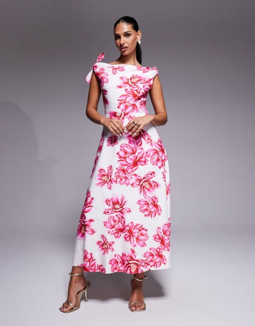 Forever New slash neck bow shoulder midaxi dress in pink floral