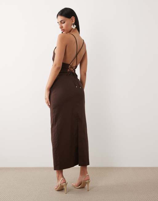 Forever New stretch linen corset back midi dress in chocolate