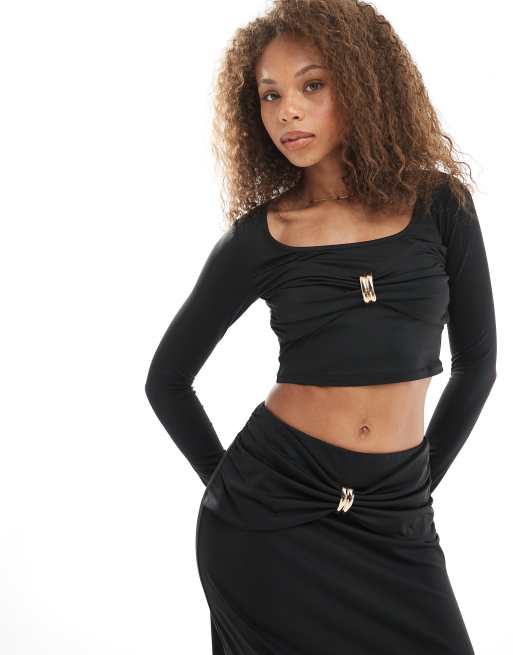 4th & Reckless - Crop top d'ensemble à manches longues et encolure dégagée avec fronces et détail métallique doré - Noir