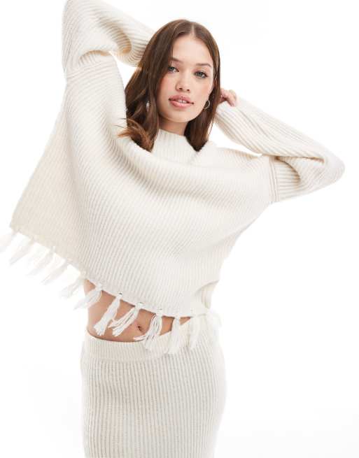 4th & Reckless - Pull d'ensemble à manches larges et bords frangés en laine mélangée - Crème