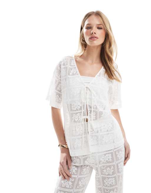 4th & Reckless - Top d'ensemble de plage en dentelle au crochet avec liens noués devant - Blanc