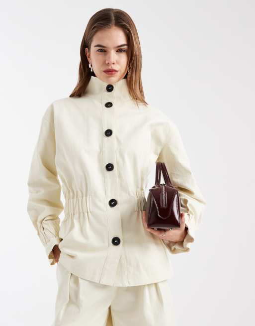 4th & Reckless - Veste d'ensemble boutonnée en coton avec col cheminée et taille froncée - Crème