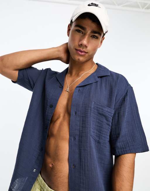 Abercrombie & Fitch - Chemise en gaze à manches courtes avec col à revers - Bleu moyen