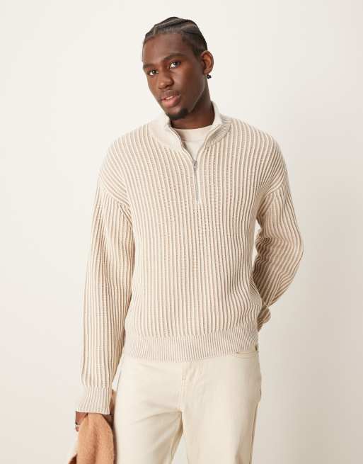Abercrombie & Fitch - Pull oversize en maille à col zippé et rayures façon surpiqûres - Crème