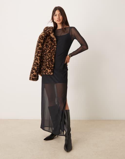 Abercrombie & Fitch - Robe longue fendue sur le côté à manches longues en tulle - Noir