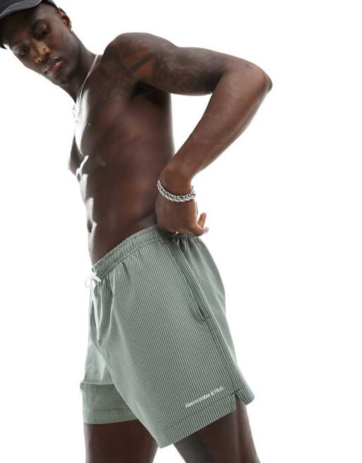 Abercrombie & Fitch - Short de bain 5 pouces en crépon à logo et rayures - Vert olive