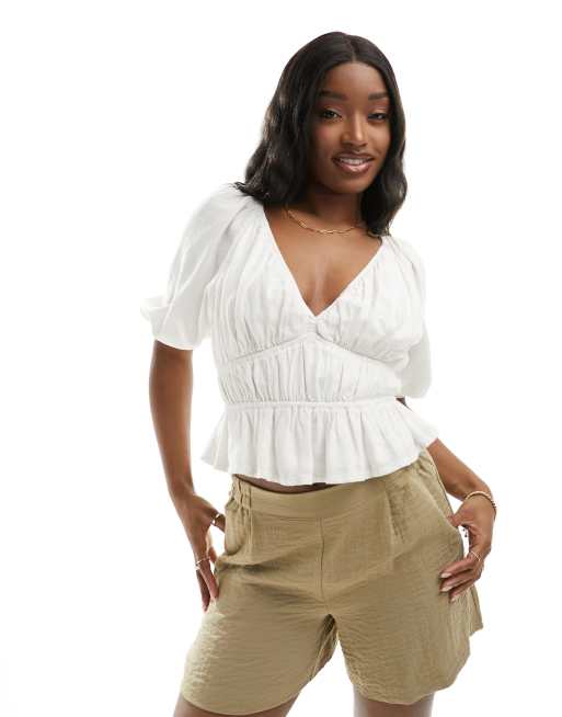 Abercrombie & Fitch - Top brodé à manches bouffantes et décolleté plongeant - Blanc