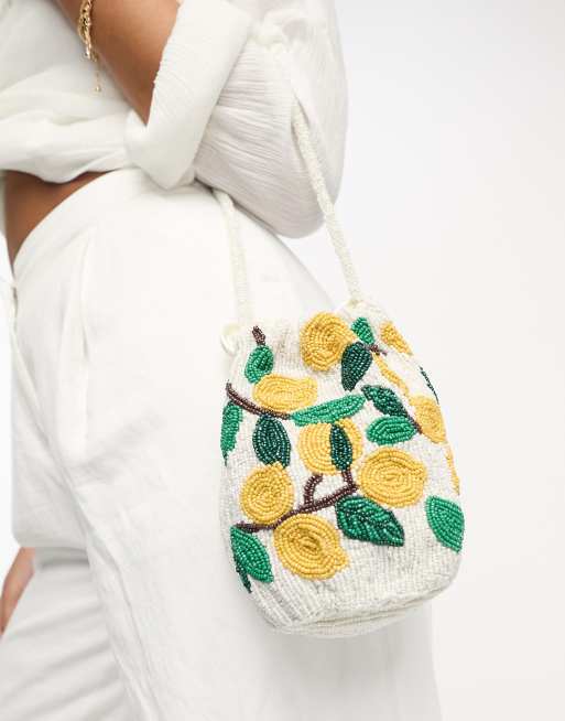 Accessorize - Petit sac à cordon de serrage avec motifs fruits ornés de perles - Jaune et blanc