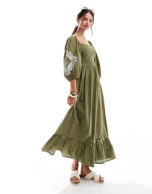 Accessorize - Robe longue de plage froncée à manches bouffantes - Vert olive