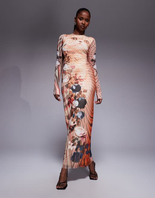 AFRM - Robe longue ras de cou à manches longues à carreaux et imprimé chaton