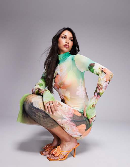 AFRM - Robe mi-longue à imprimé fleuri avec manches longues et col cheminée - Vert