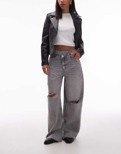 AllSaints - Aki - Jean large à taille croisée - Gris moyen délavé