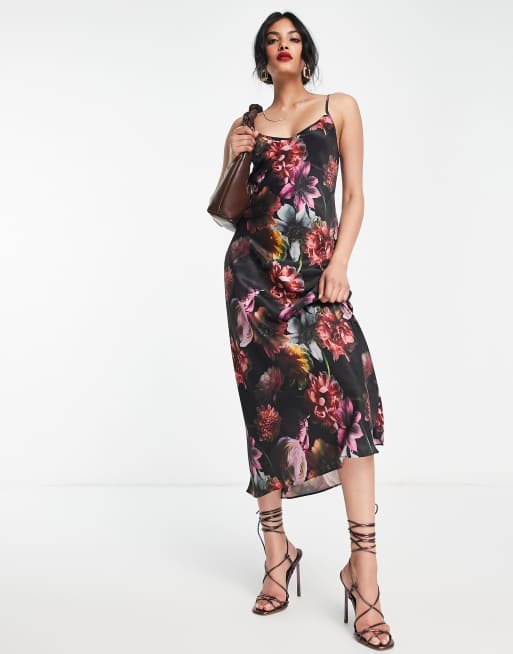 AllSaints - Melody - Robe nuisette mi-longue en satin - Noir fleuri