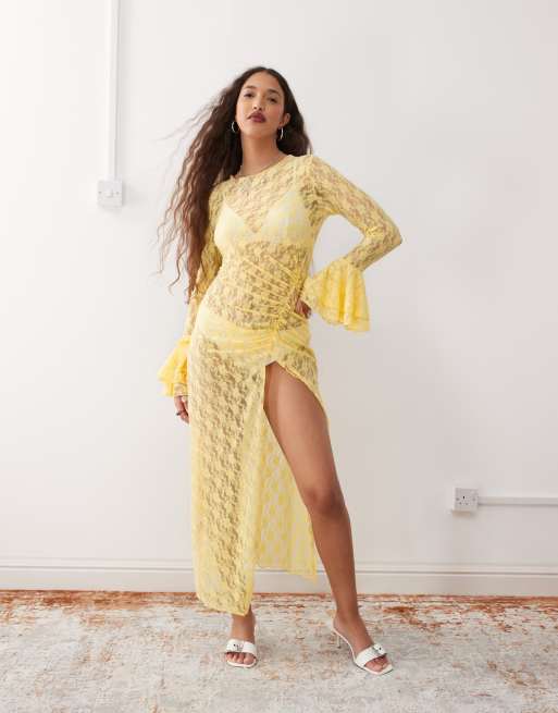 Amy Lynn - Robe longueur mollet transparente en dentelle avec fente froncée - Jaune