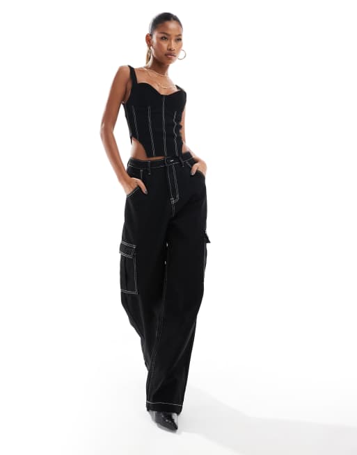 Aria Cove - Ensemble avec jean ample et top corset en denim à coutures contrastantes - Noir