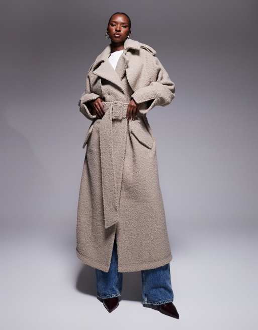 Aria Cove - Trench-coat long en bouclé avec ceinture et grand col - Moka