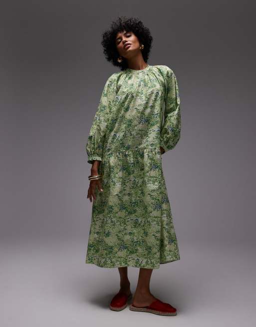 ARKET - Robe babydoll longueur mollet à taille basse en coton imprimé feuilles - Vert