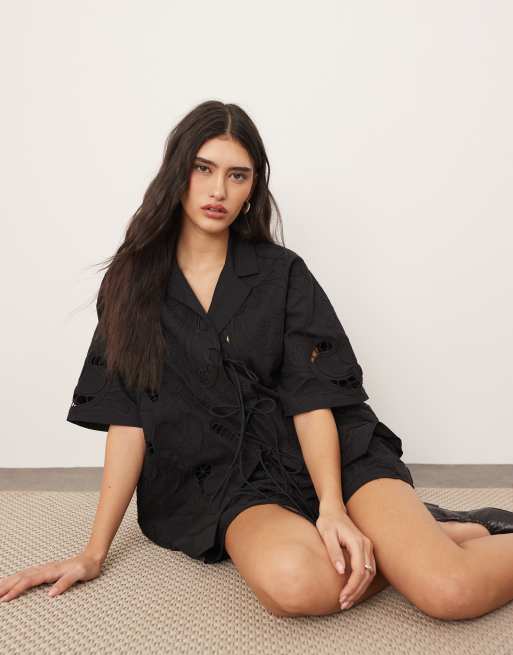 ARRANGE - Chemise d'ensemble nouée sur l'avant en coton avec manches courtes et broderies ajourées - Noir
