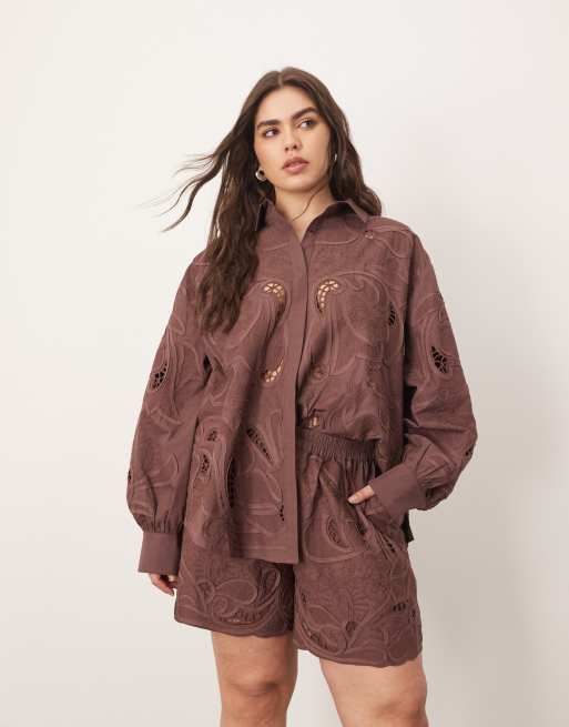 ARRANGE Curve - Chemise d'ensemble en coton à fleurs brodées et ajourées effet miroir - Chocolat