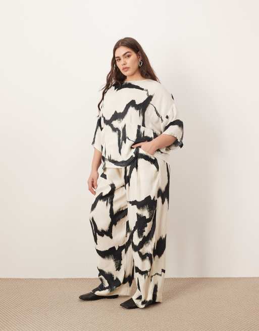 ARRANGE Curve - Pantalon droit d'ensemble en satin à imprimé abstrait - Noir et blanc