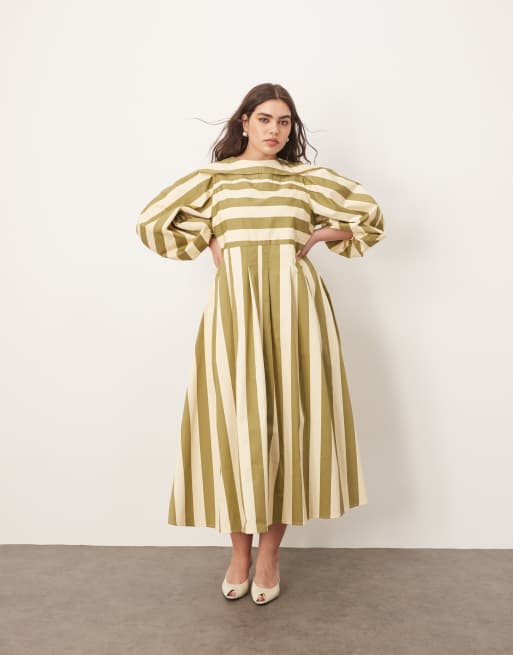 ARRANGE Curve - Robe ample mi-longue avec détail plissé - Rayures olive