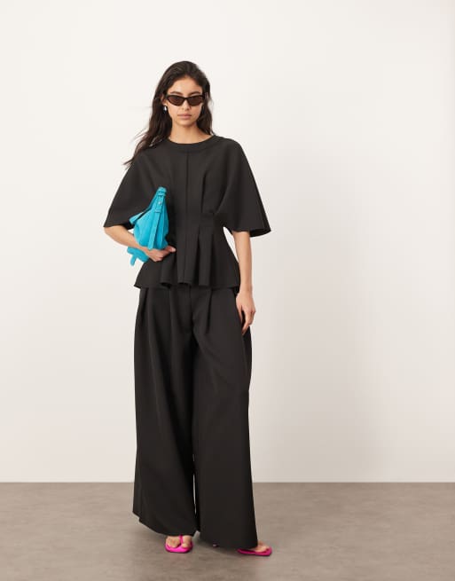 ARRANGE - Ensemble plissé à la taille avec pantalon ajusté coupe ample et top à manches courtes - Noir