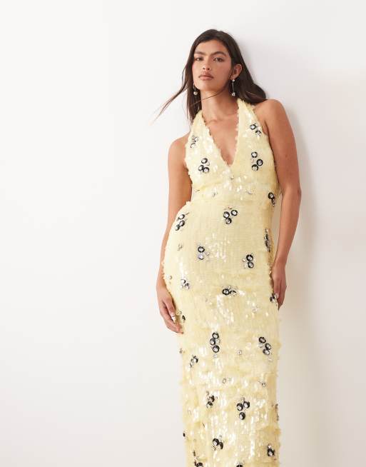 ARRANGE - Robe droite longue à décolleté plongeant ornée de strass - Jaune beurre