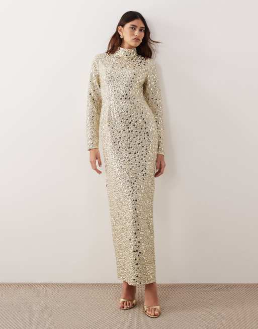ARRANGE - Robe longue à sequins texturés avec col montant et manches longues - Beurre