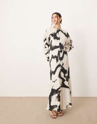 ARRANGE - Robe longue à volants, dos ouvert et manches longues - Imprimé abstrait noir et blanc
