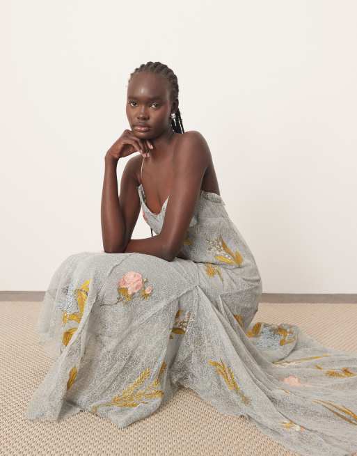 ARRANGE - Robe longue en dentelle avec broderie fleur - Bleu cendré