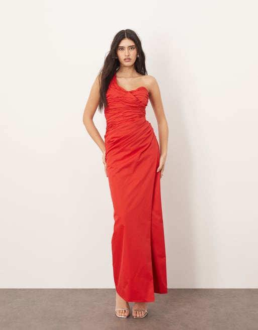 ARRANGE - Robe sculptée coupe longue et asymétrique en tissu drapé - Rouge